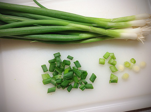 The base of the Green Onion– the white part – has the most intense flavor and is often used in cooking, while the tops – the green part – are typically chopped and used as a raw topping.