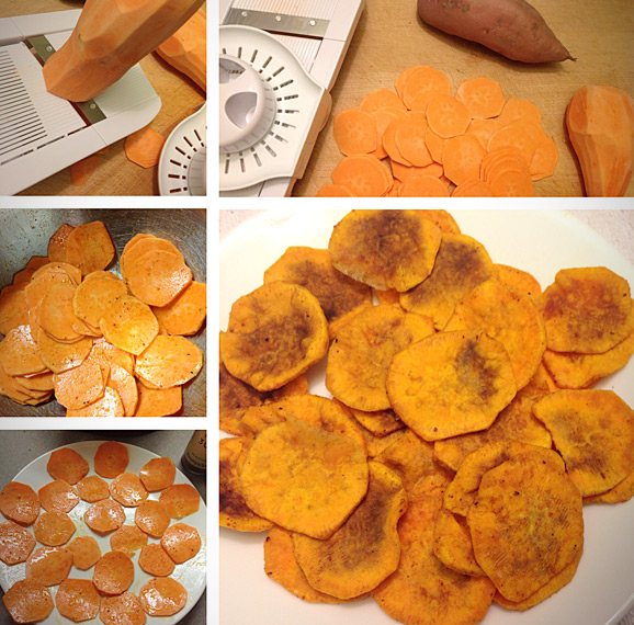 - Slice Sweet Potatoes into 1/8″ thin rounds (a mandolin slicer works best)